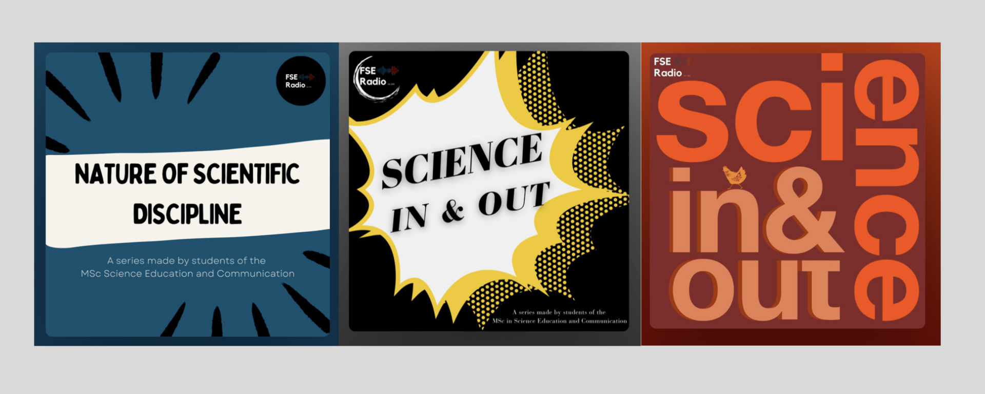Titled “Science In & Out”, the podcast series comprised of the episodes produced for NSD, is in its third season. Each season varies in length since depending on the amount of students taking the course that year, but no scientific topic is repeated – ranging from phononic metamaterials to agroecology there are currently 11 episodes on scientific disciplines in total. The covers for each season are all distinct and created by the students, giving each of them a unique identity. All episodes can be found on the FSE Radio podcast on Spotify.